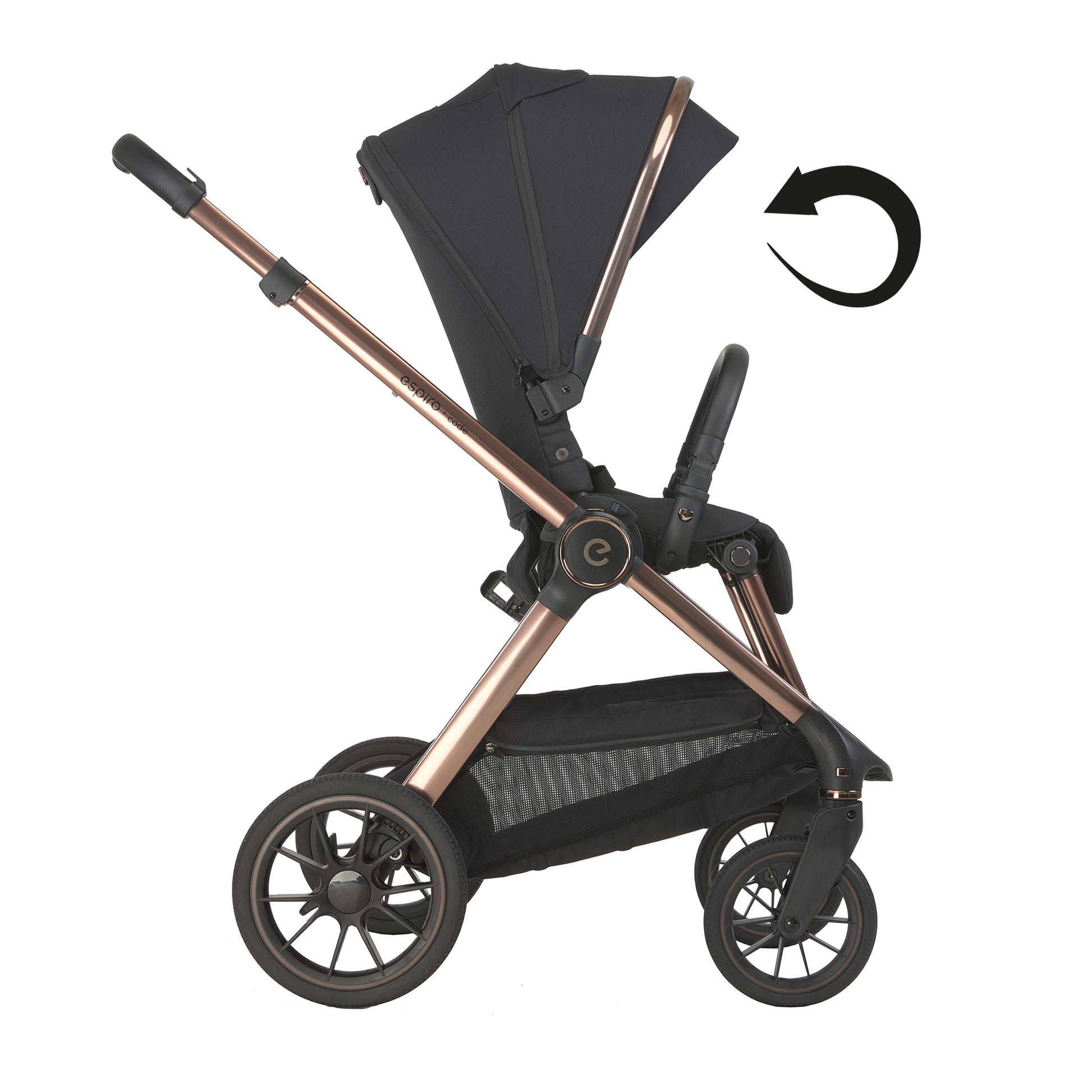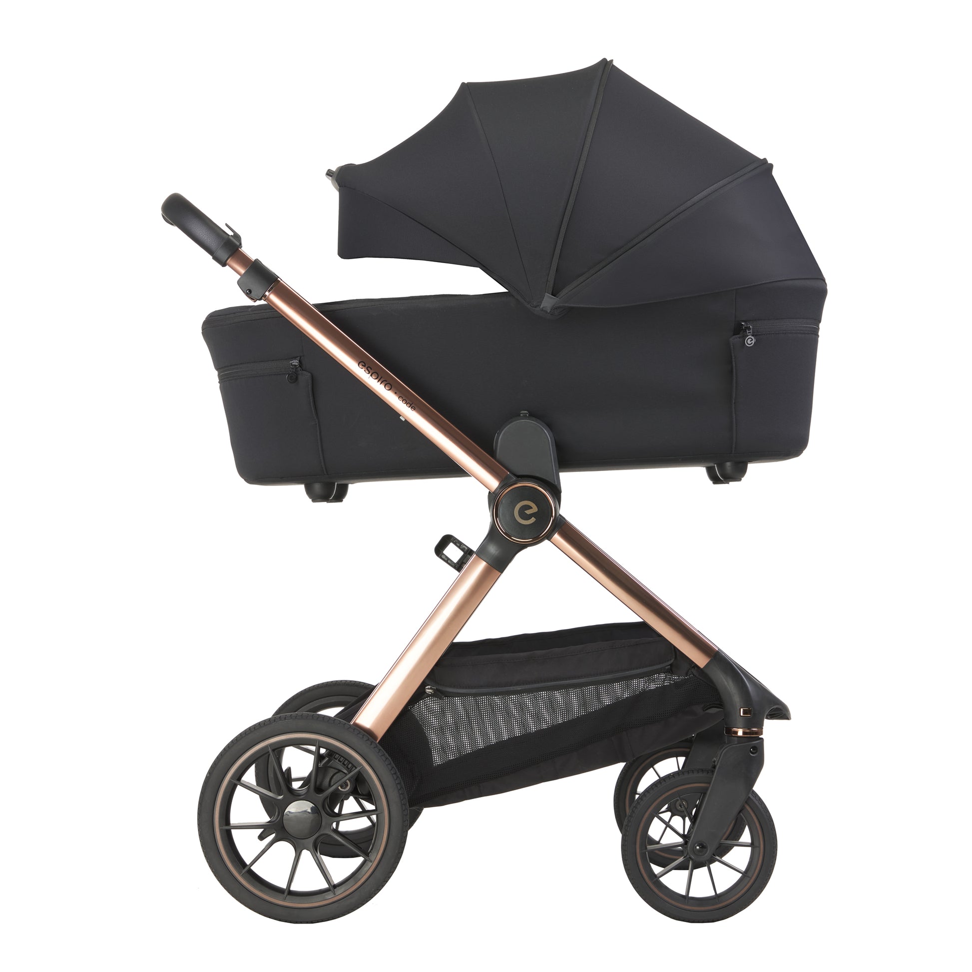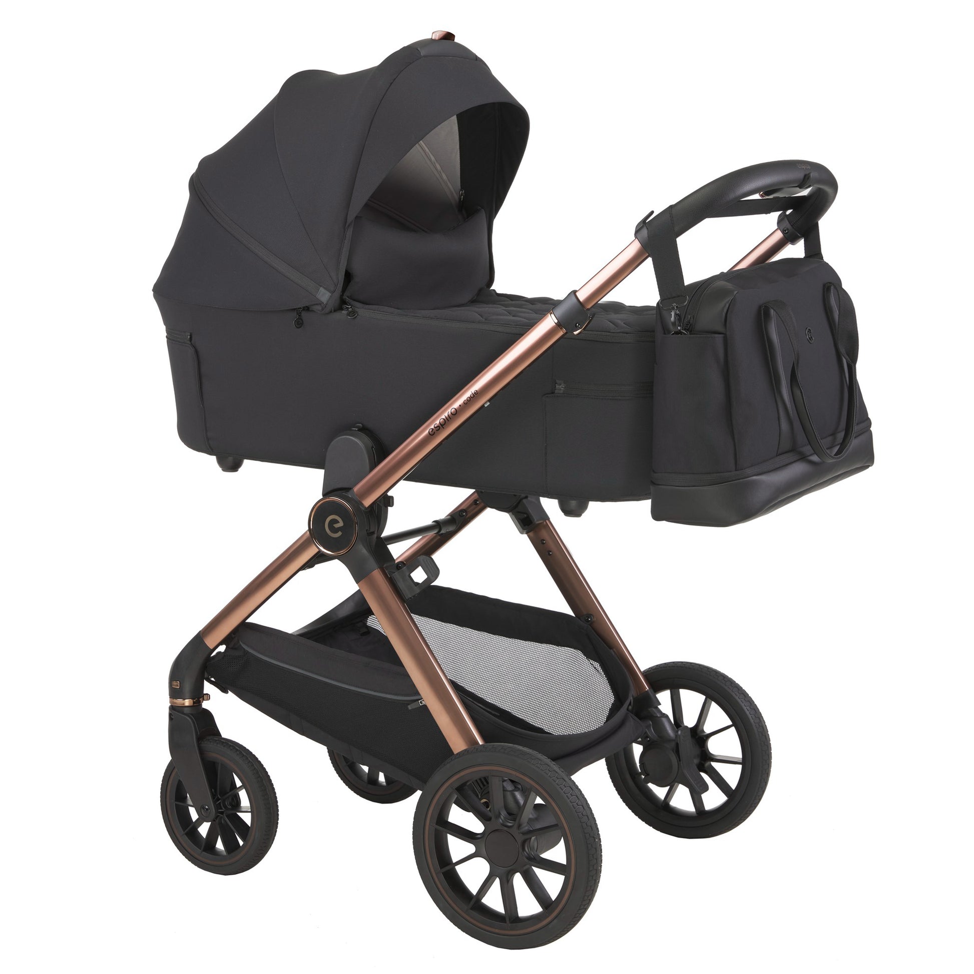 Espiro Code përfshin korbe (gondola) dhe sedilje sportive, të cilat montohen lehtësisht në shasi, duke u përshtatur me çdo fazë të rritjes së fëmijës.