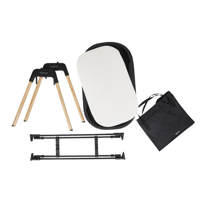 Kradle ka materac të butë me mbulesë bambu, e cila është e çmontueshme dhe e lahet, për higjienë të lartë dhe mbrojtje maksimale. Mbështetjet nga druri me pamje natyrale shtojnë stil minimalist dhe përshtaten lehtë në ambientet moderne. espiro.pl